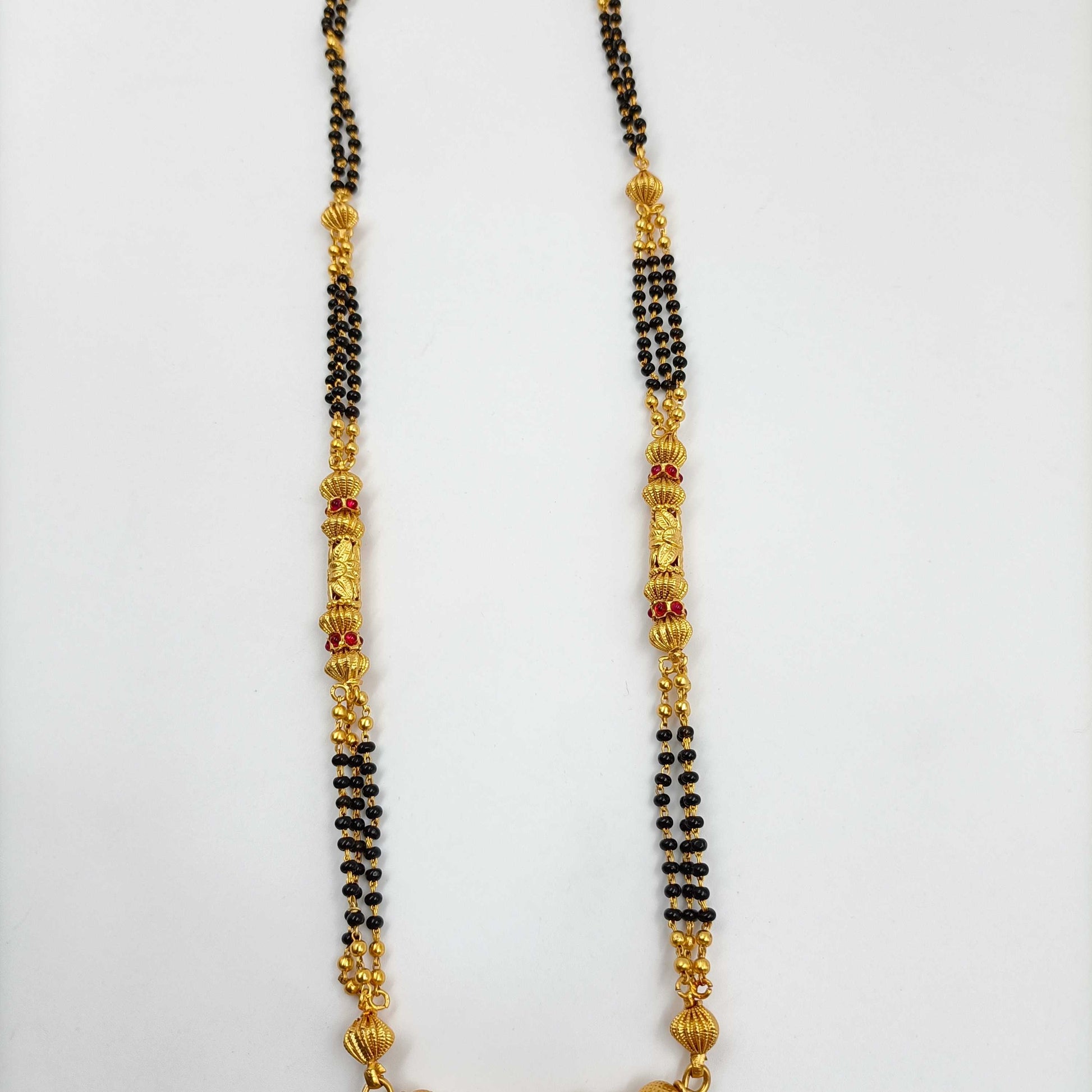 Take a look at this gold (matte) finish mangalsutra from Shree Radhe Pearls Jewellery. This long mangalsutra has intricately designed chains and golden, black colored beads. This mangalsutra has attractive pendant. This mangalsutra with your traditional festive outfits for a classic look.