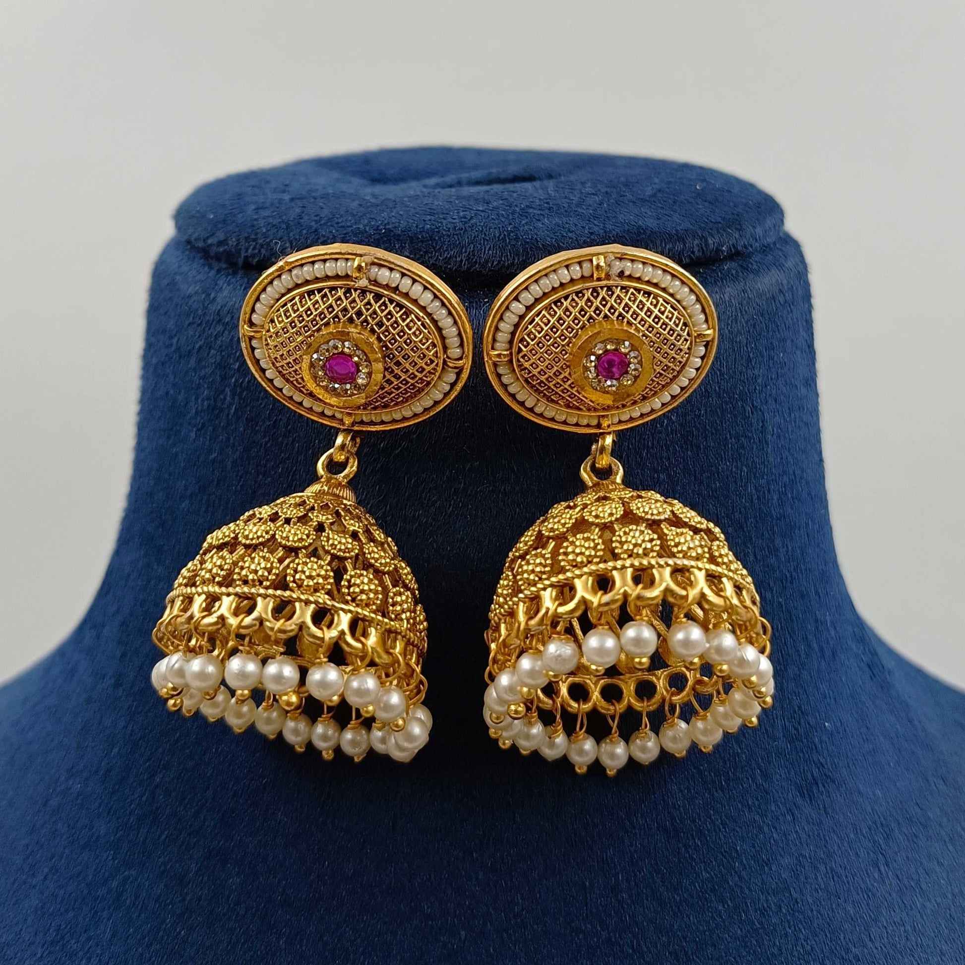 Beautiful matte gold finish sparkling temple necklace with beautiful earring. From Shree Radhe Pearls jewellery. Made with superior quality matte gold finish metal. Classy sparkling stones studded necklace with matching earrings set.