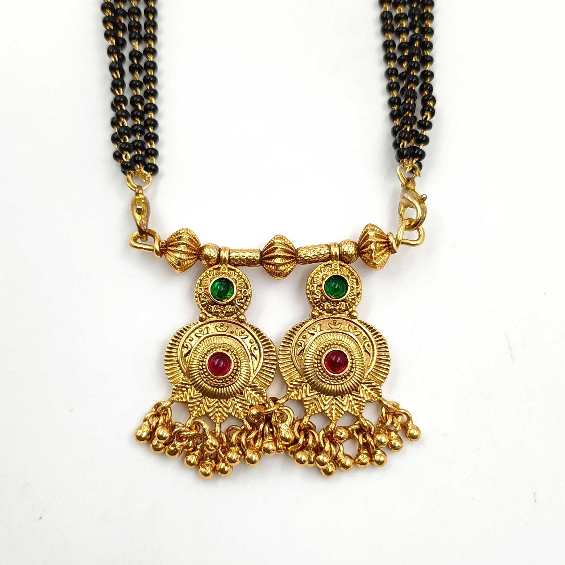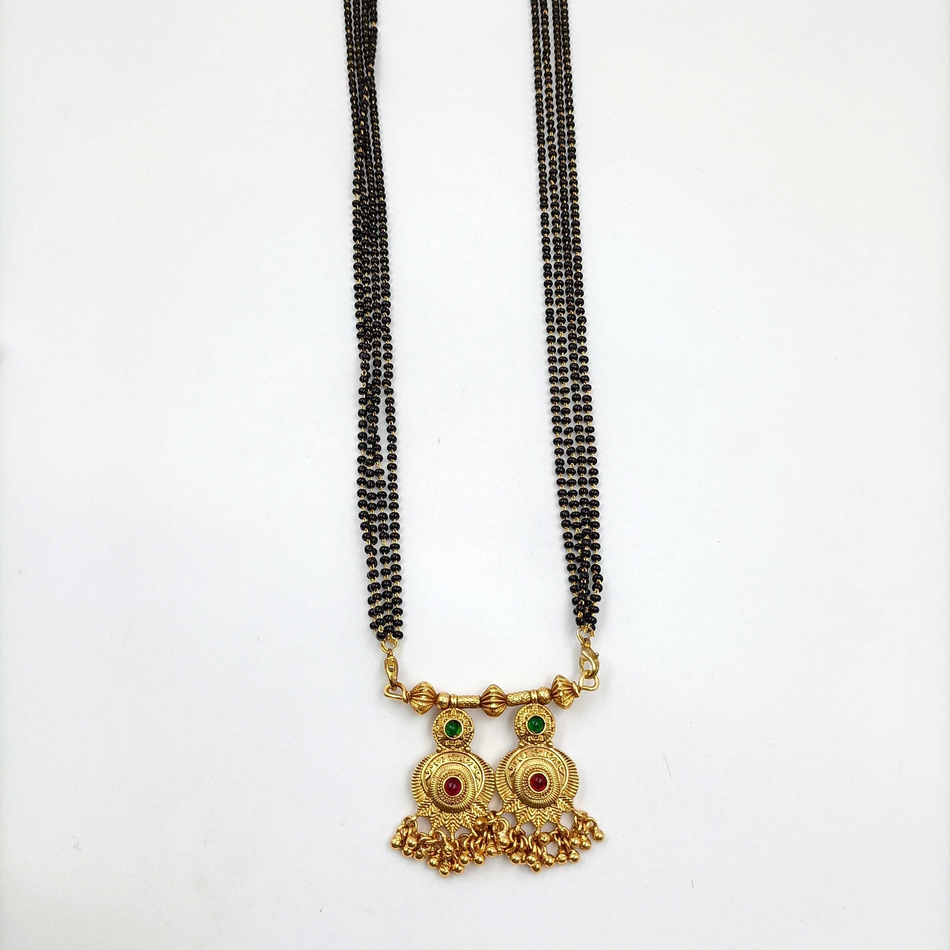 Classy designed this golden finish Mangalsutra from Shree Radhe Pearls Jewellery will appeal to you at very first look. This mangalsutra is superior in quality and will be your fashion companion for many years. It comes with stone along with golden beads with lots of compliments.