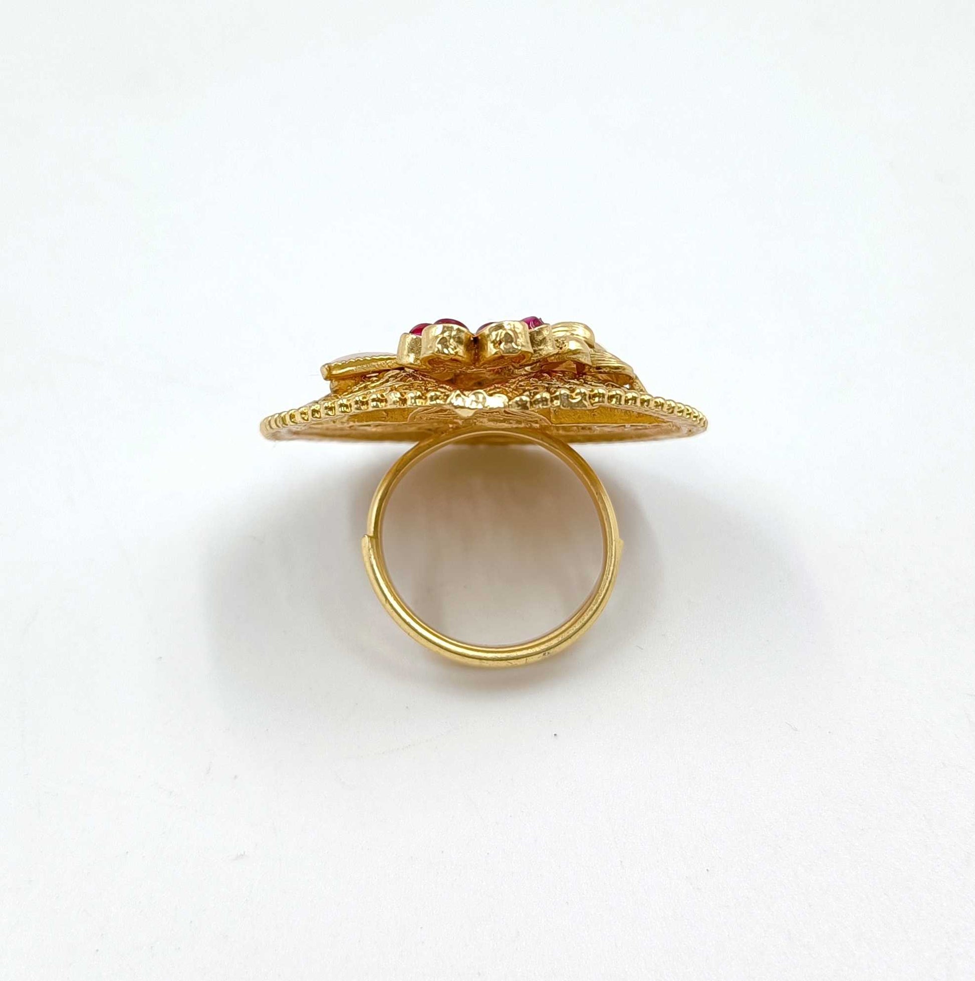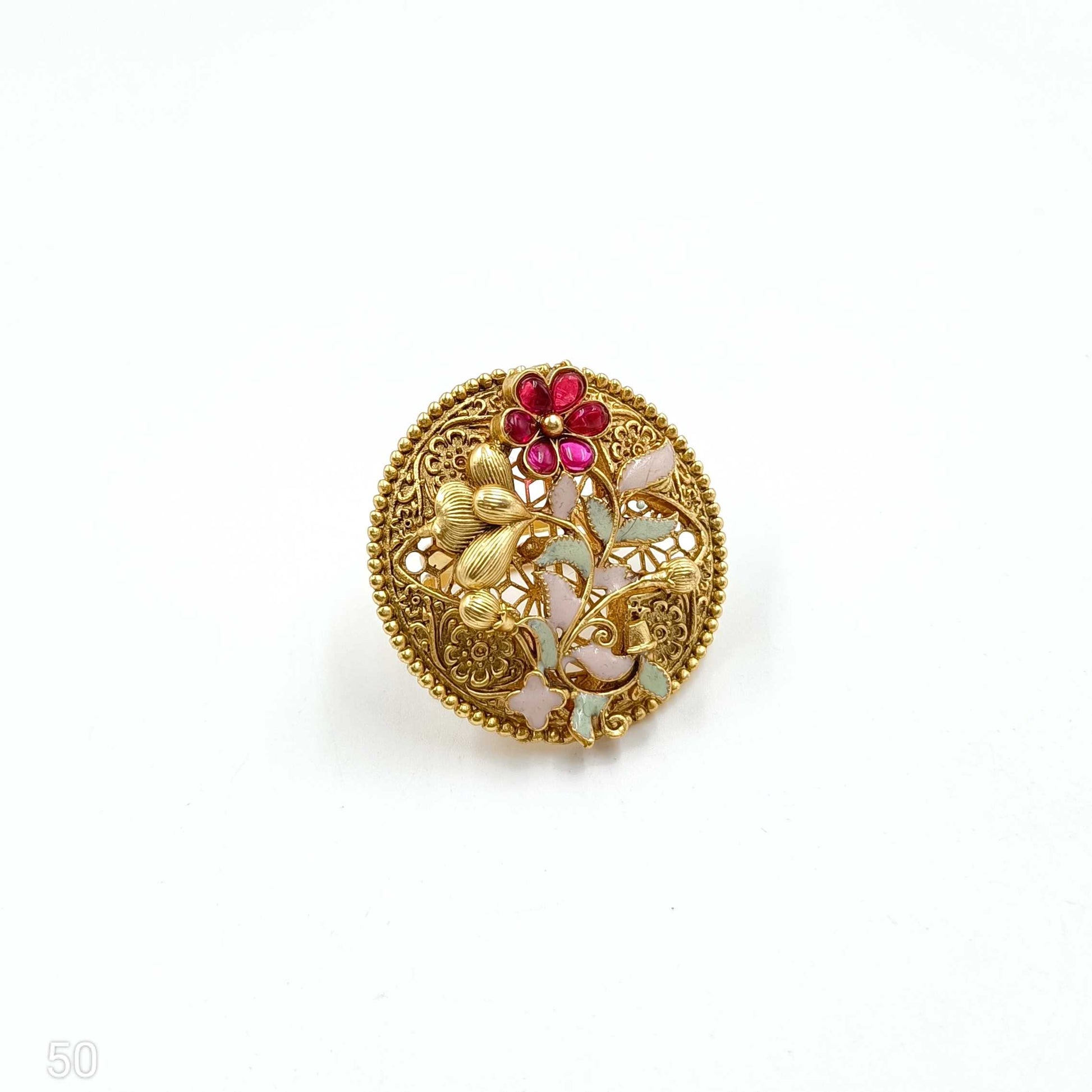 Finger Rings Adjustable Round Antique Golden Finish Adjustable Finger Rings...... Antique Golden Finish Finger Ring,Silver & copper based finger ring with stones delightfully crafted design & colour combination which will go with any outfit. Matchable with Gold jewellery. Round golden finish finger ring. Traditional wear Finger Ring Antique Finish