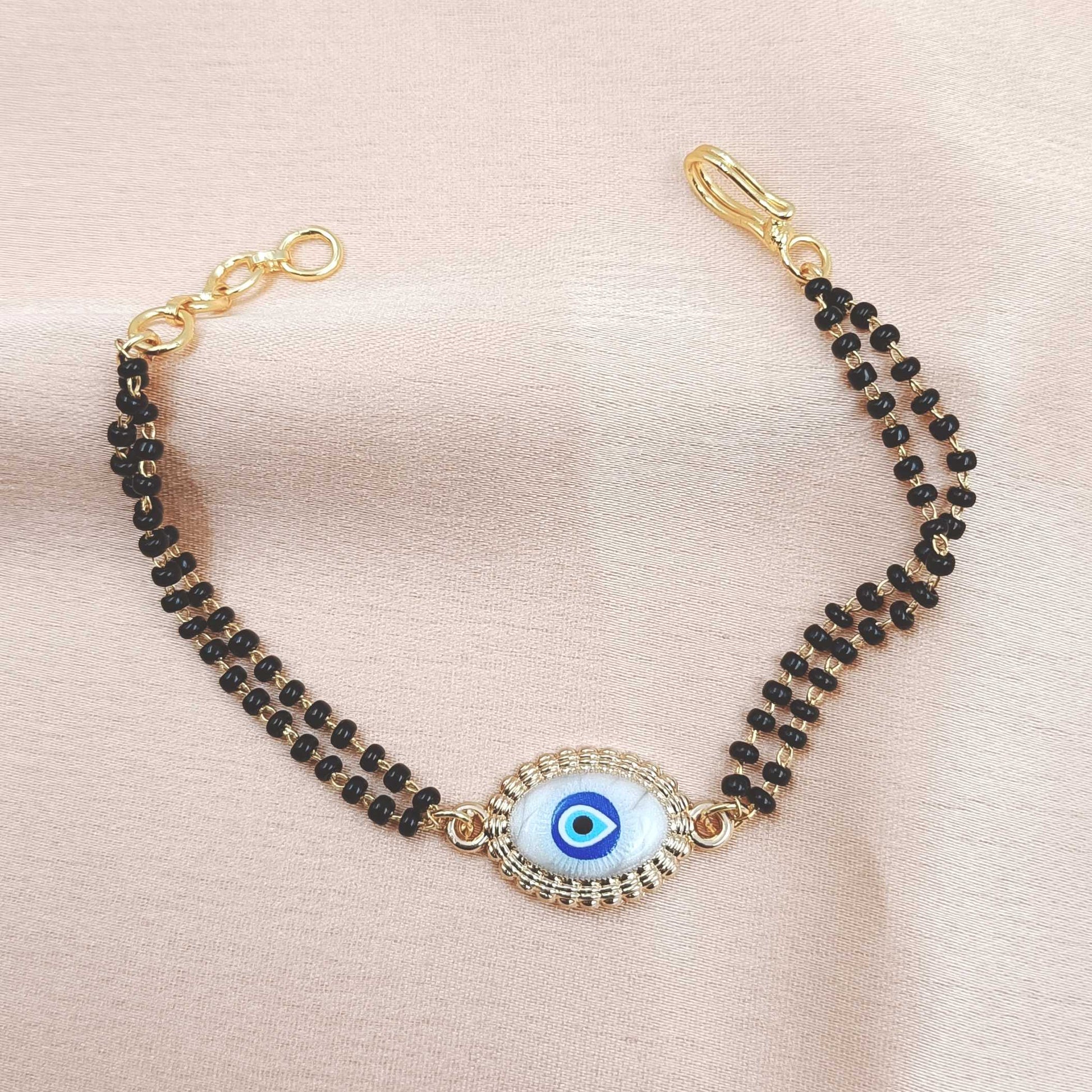 Checkout this beautiful evil eye designer mangalsutra bracelet from Shree Radhe Pearls Jewellery. which is truly very attractive. It is made from golden finish metal. It is good in quality and skeen-friendly as well.