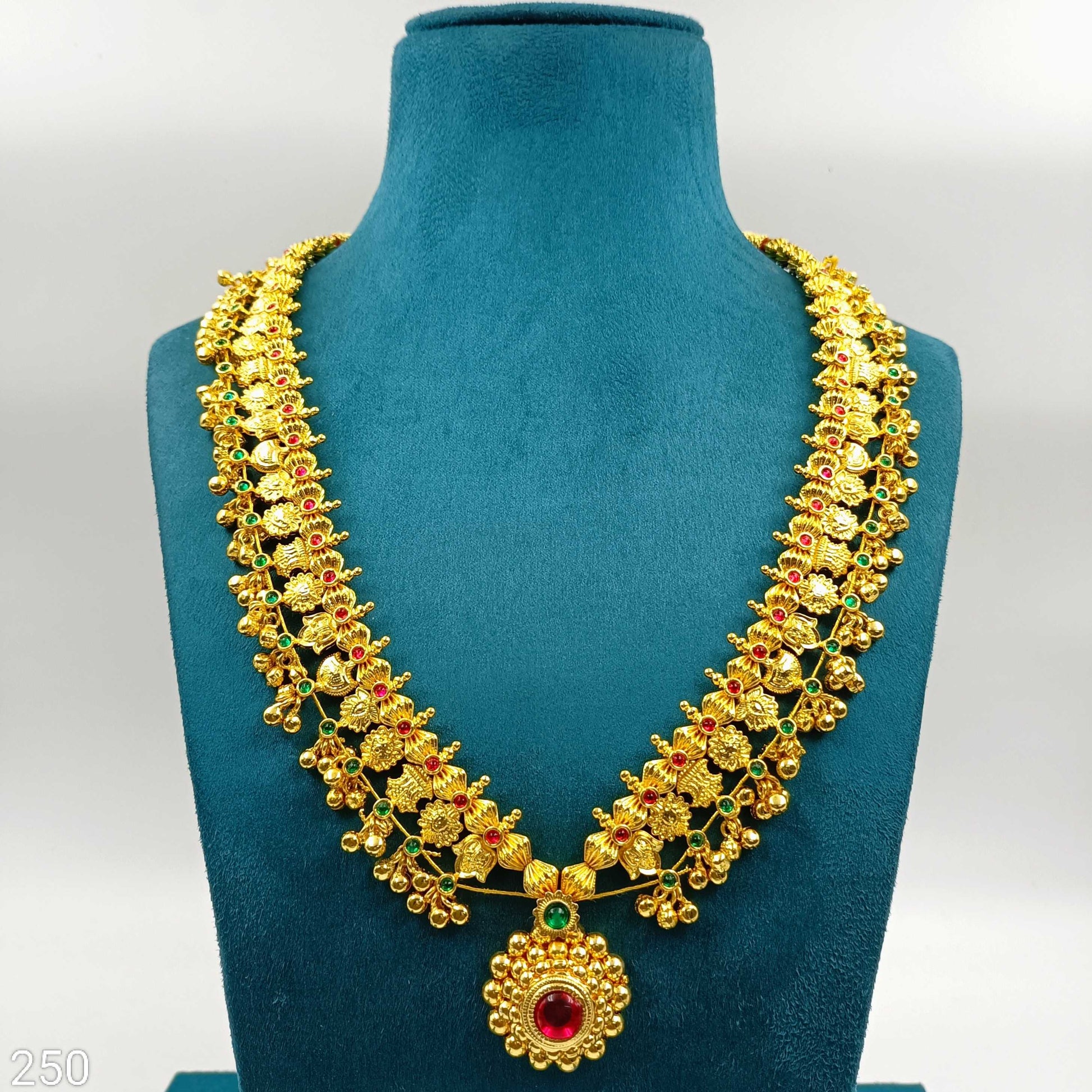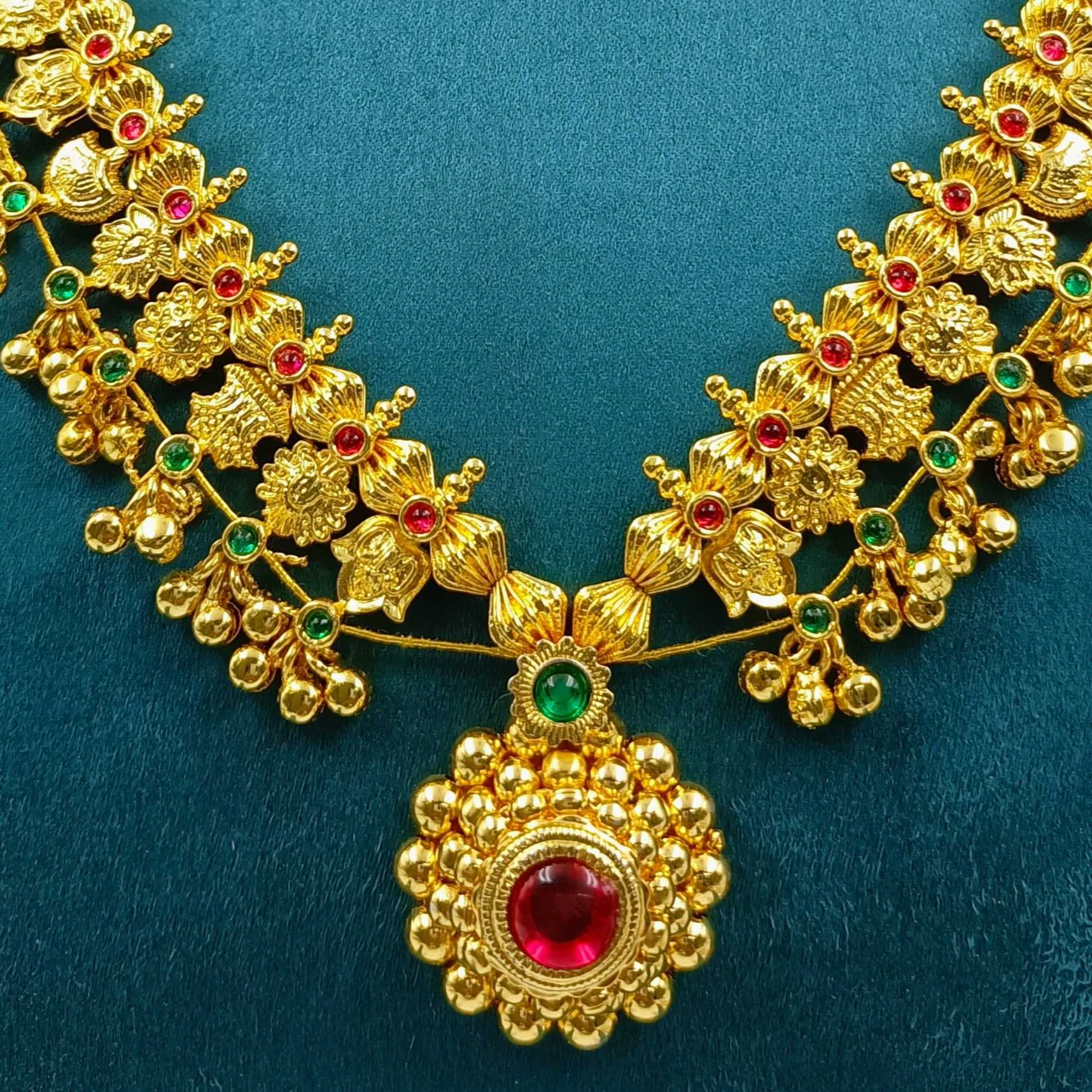This is truly an unique half moon designer Kolhapuri saaj necklace from Shree Radhe Pearls Jewellery. This necklace has a design pendant along with sparkling stone. This necklace is crafted from golden finish metal. This Kolhapuri saaj is light weight and thus can be easily wear with your paithani saree outfit.