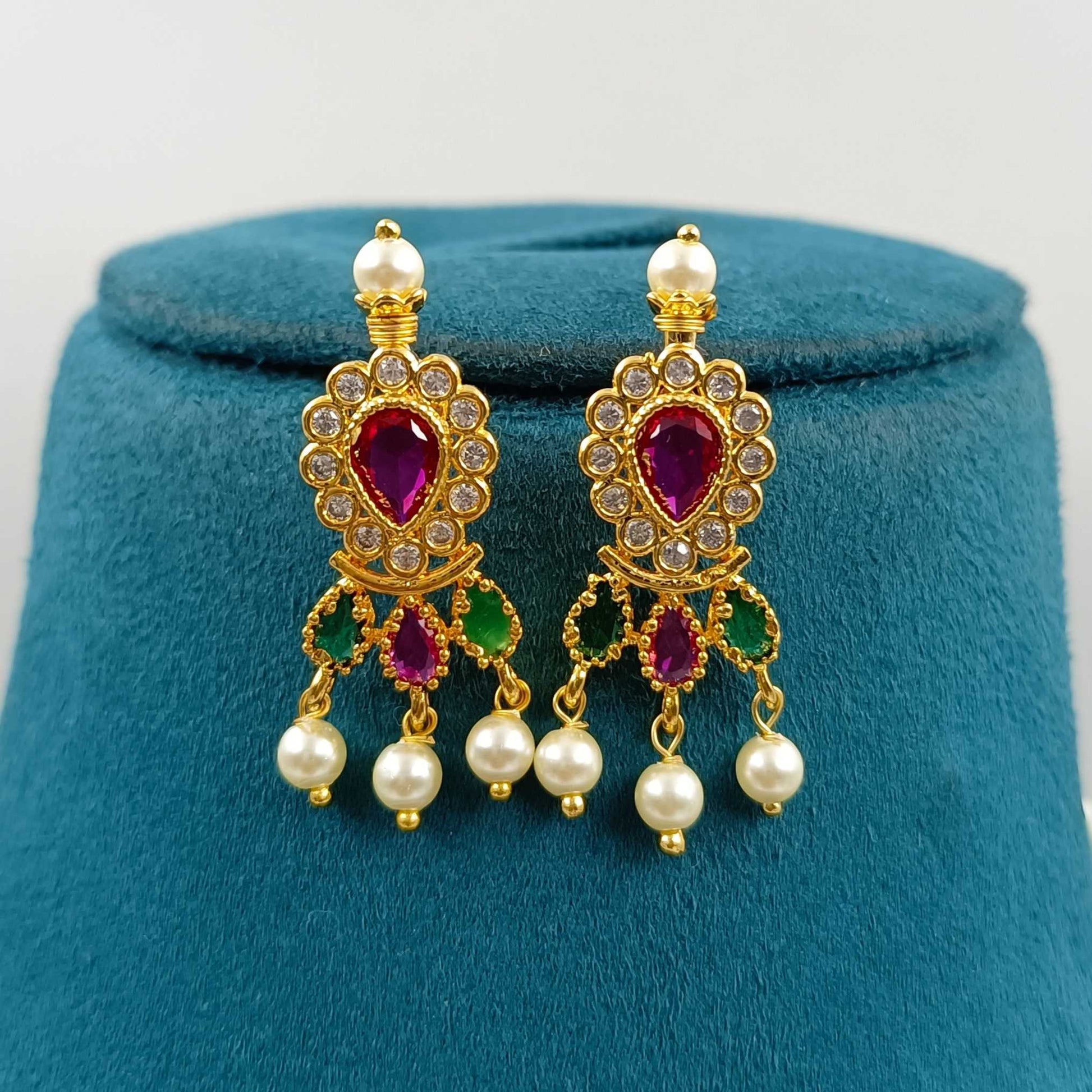 Complete your classy look by wearing this wonderful necklace set with your traditional look. It is decked with sparkling stones and fashioned from golden finish metal. It is excellently woven with pearl beads. This necklace set is good in quality and will be your fashion companion for many years