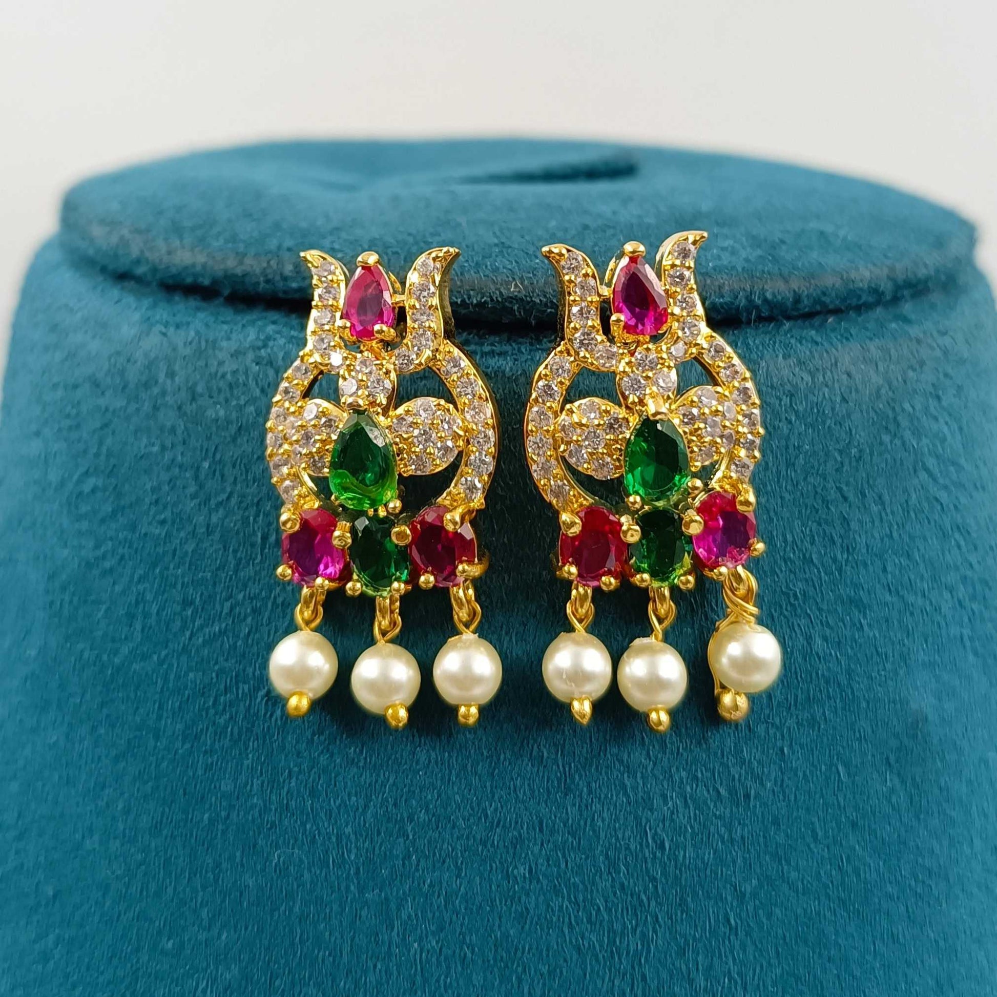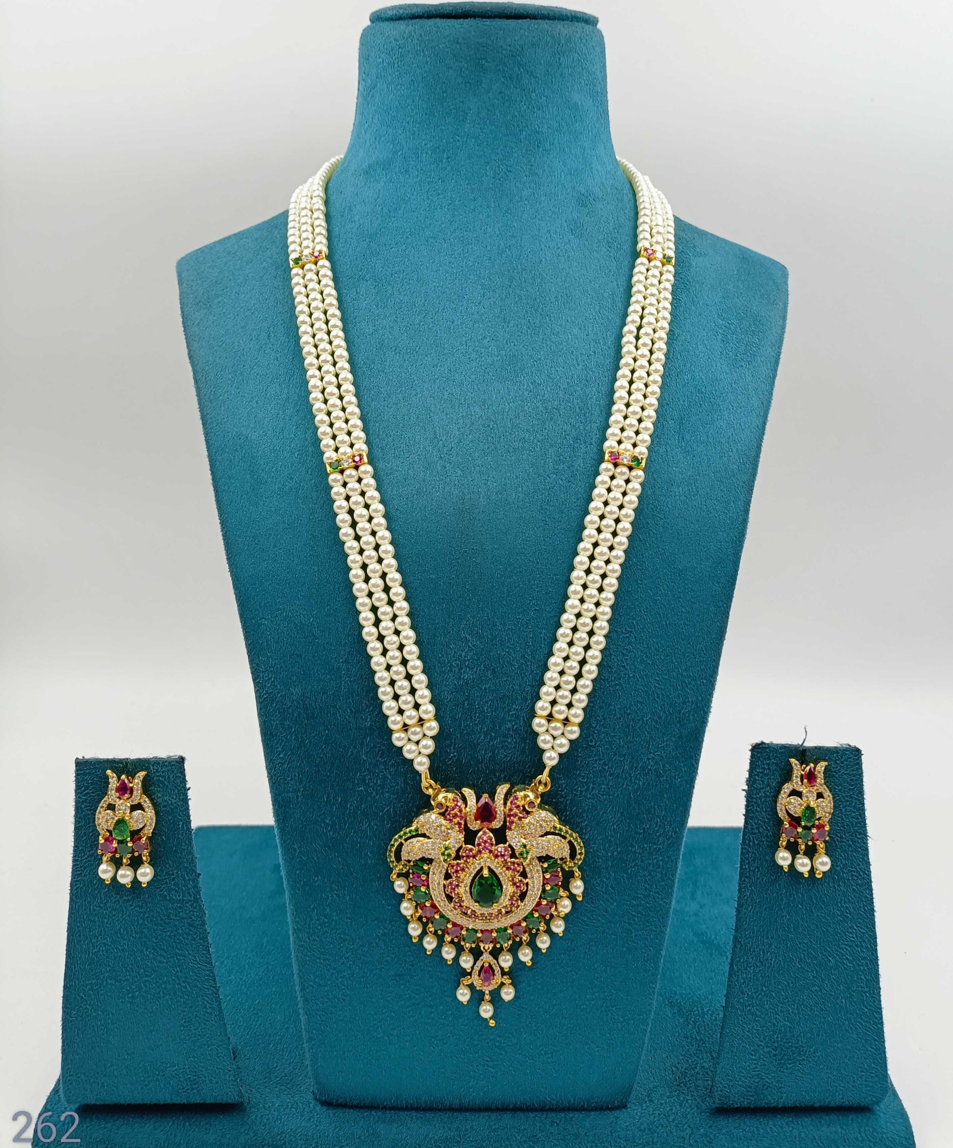 Complete your classy look by wearing this wonderful necklace set with your traditional look. It is decked with sparkling stones and fashioned from golden finish metal. It is excellently woven with pearl beads. This necklace set is good in quality and will be your fashion companion for many years