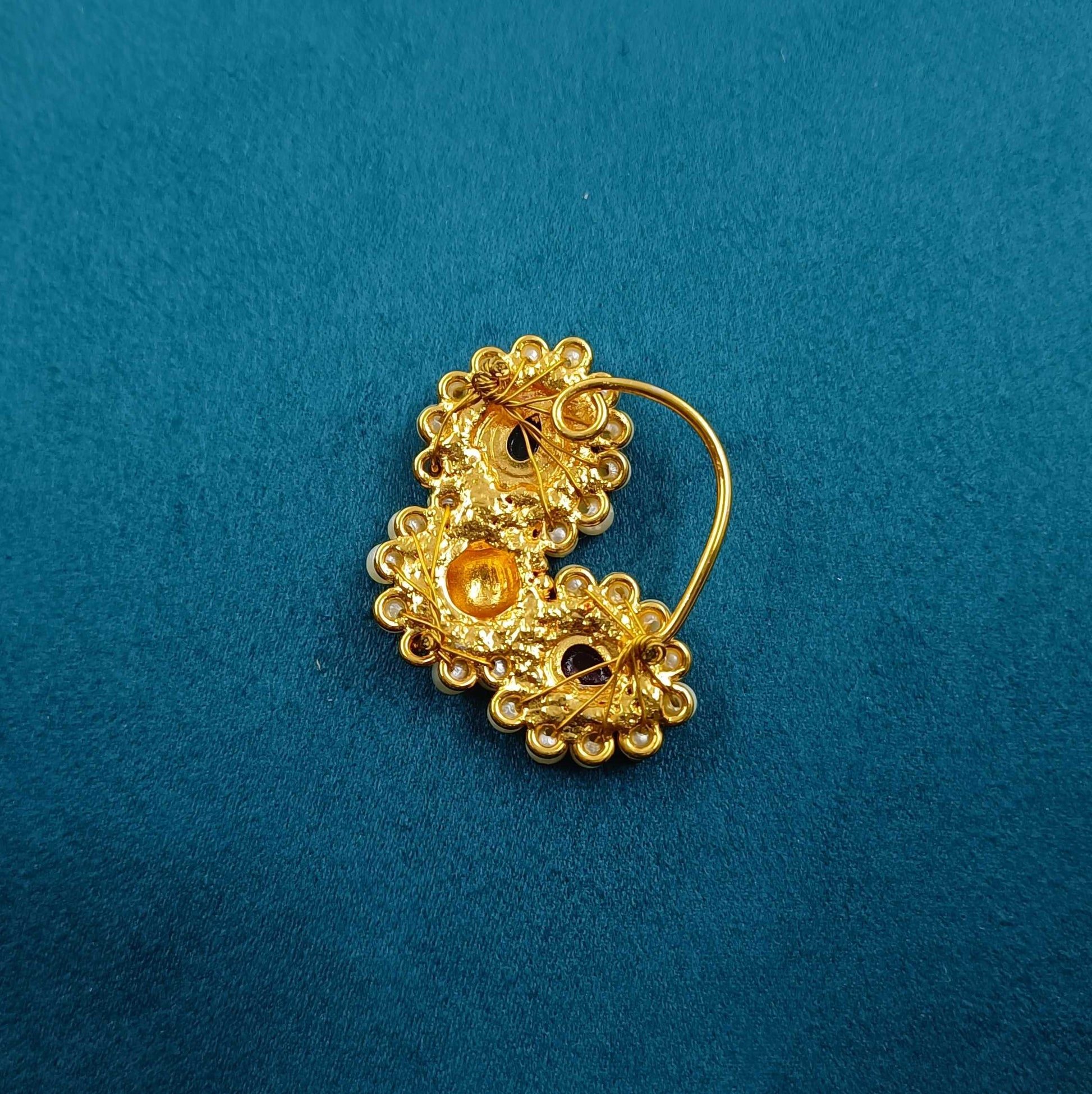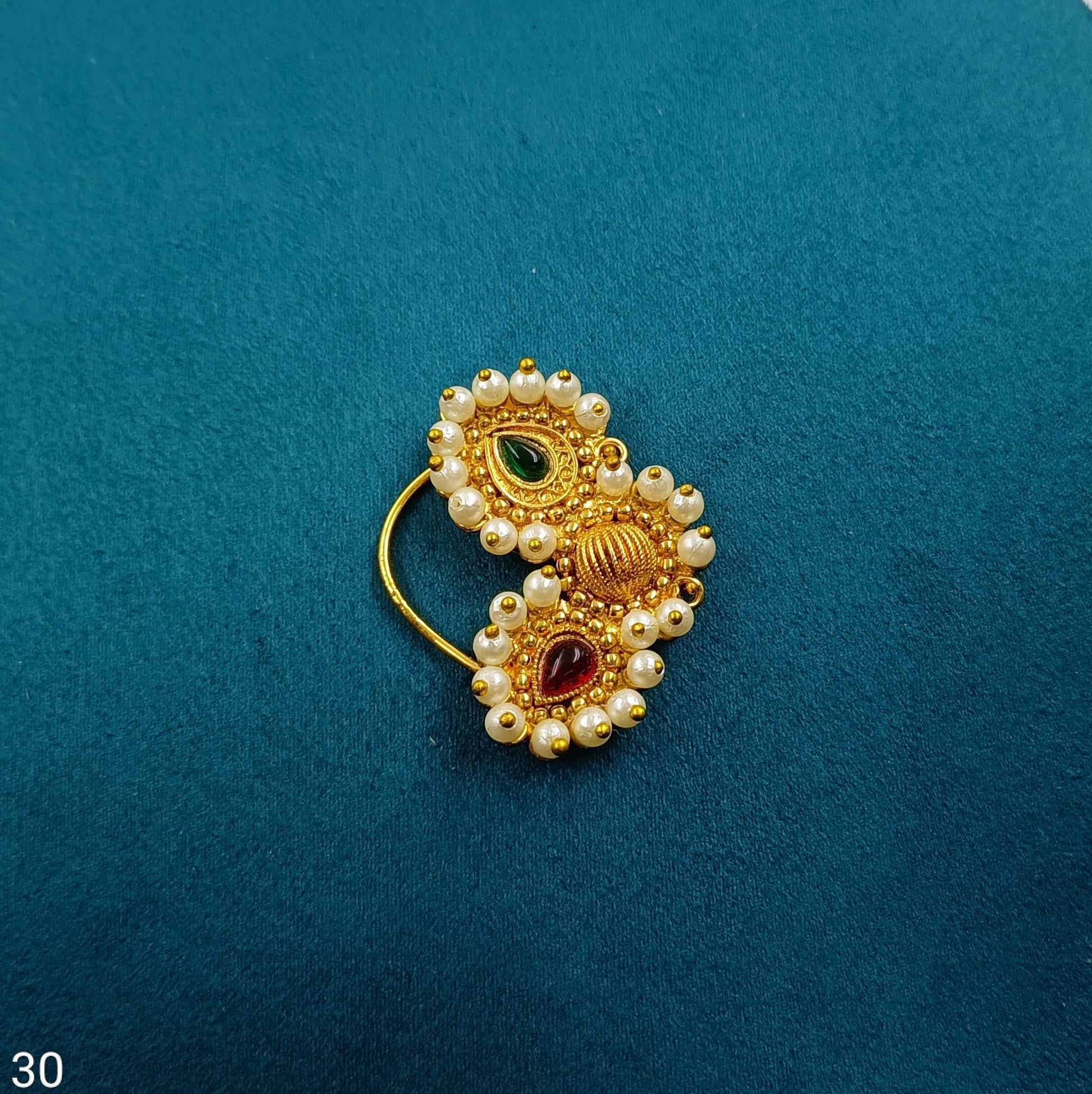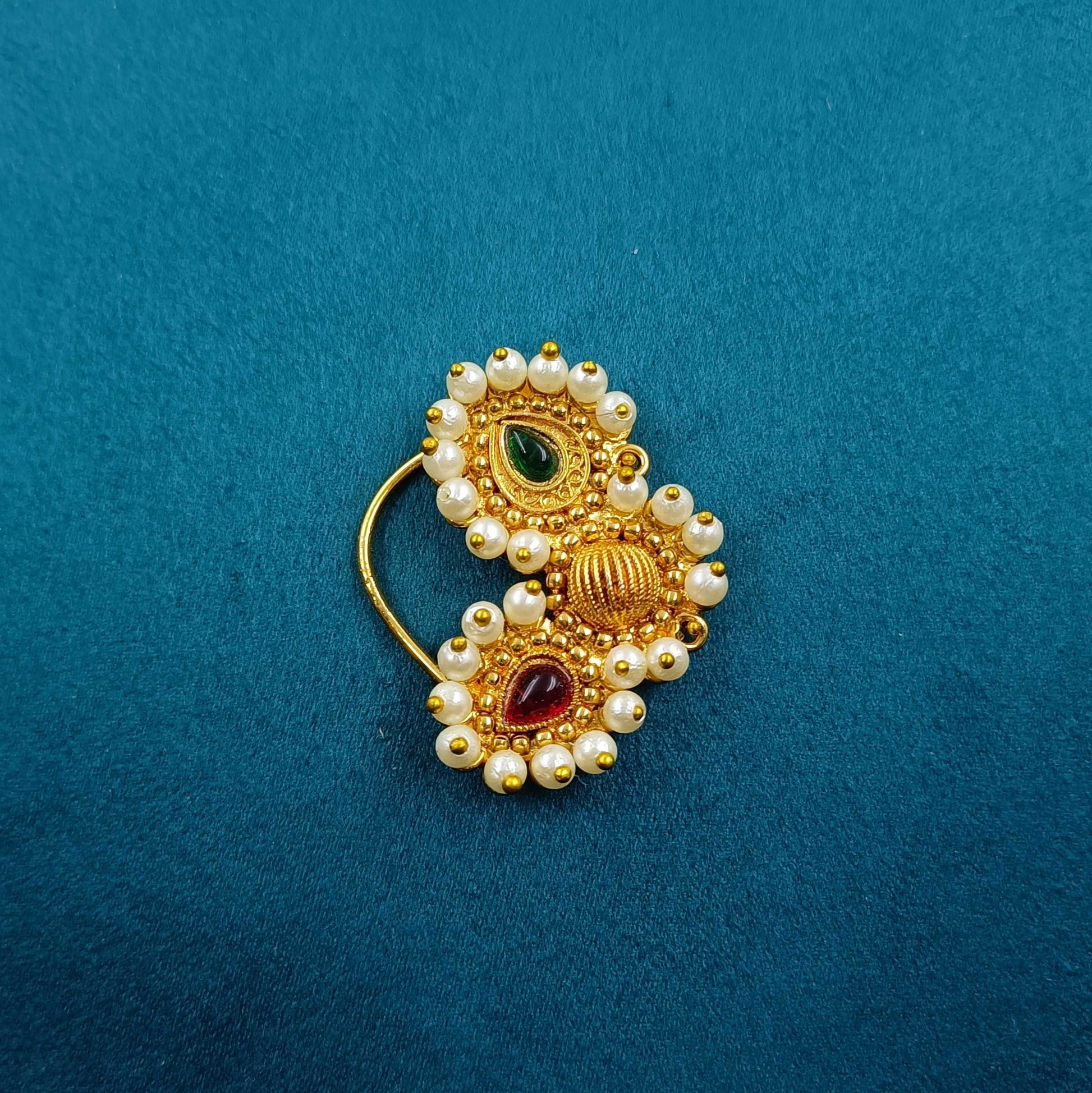 Must have in your accessory moti collection this stunning Maharashtrian nath from Shree Radhe Pearls Jewellery. It is encrusted with sparkling pink, green stones and fashioned from golden finish metal. This nath is easy to wear and not requires piercing.