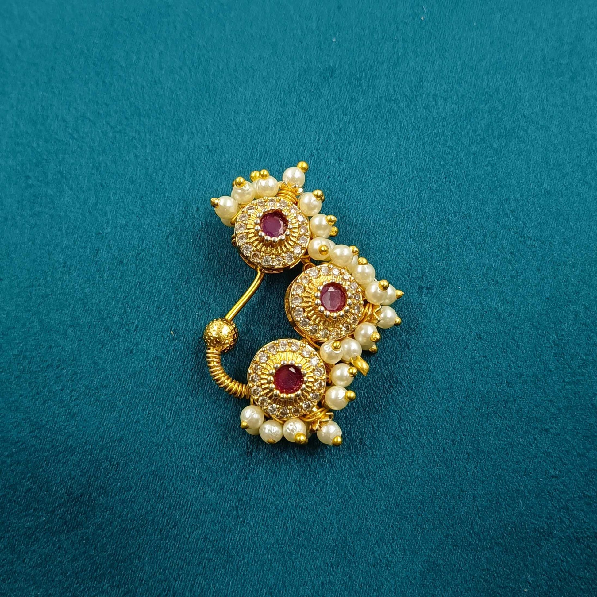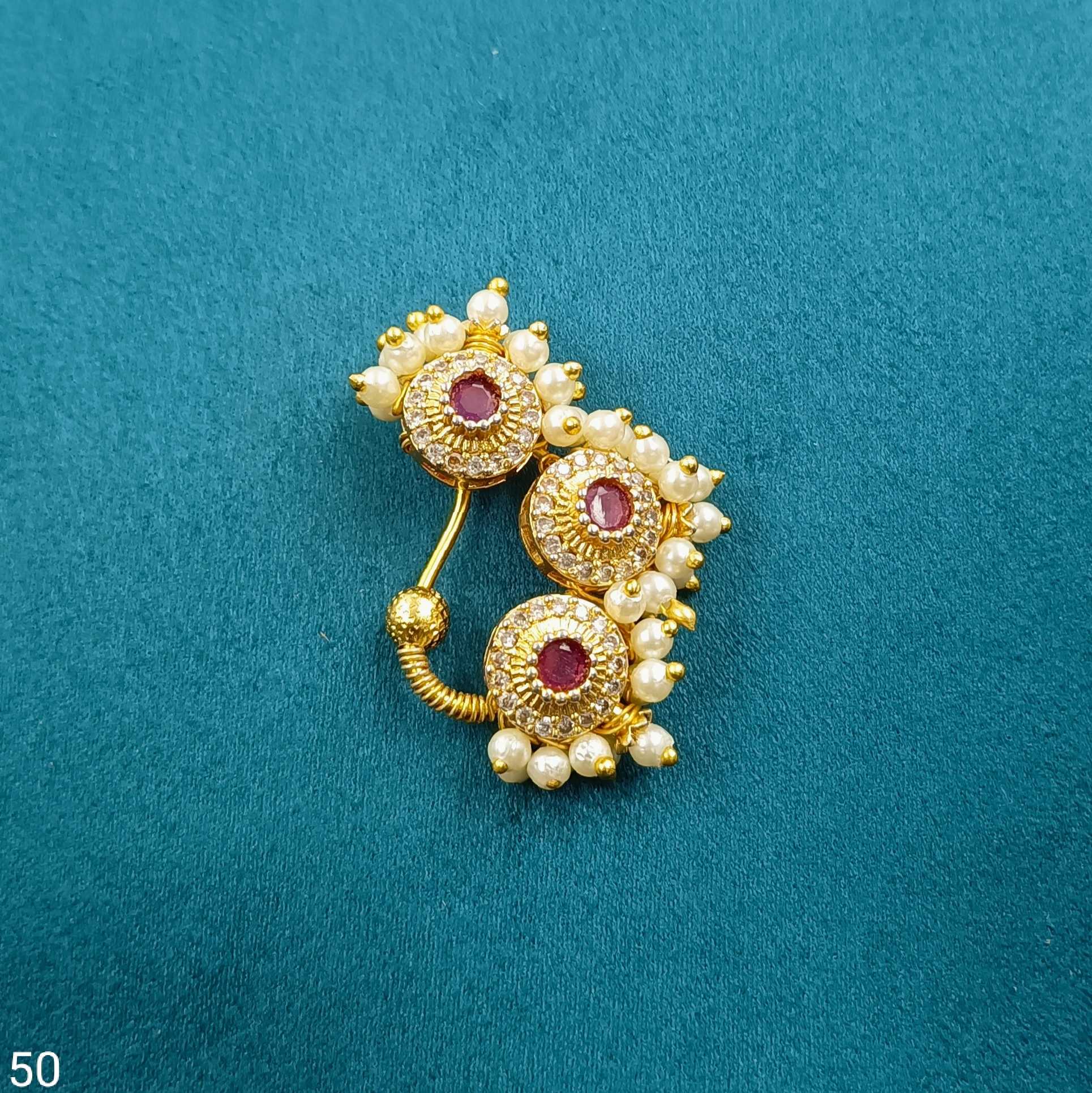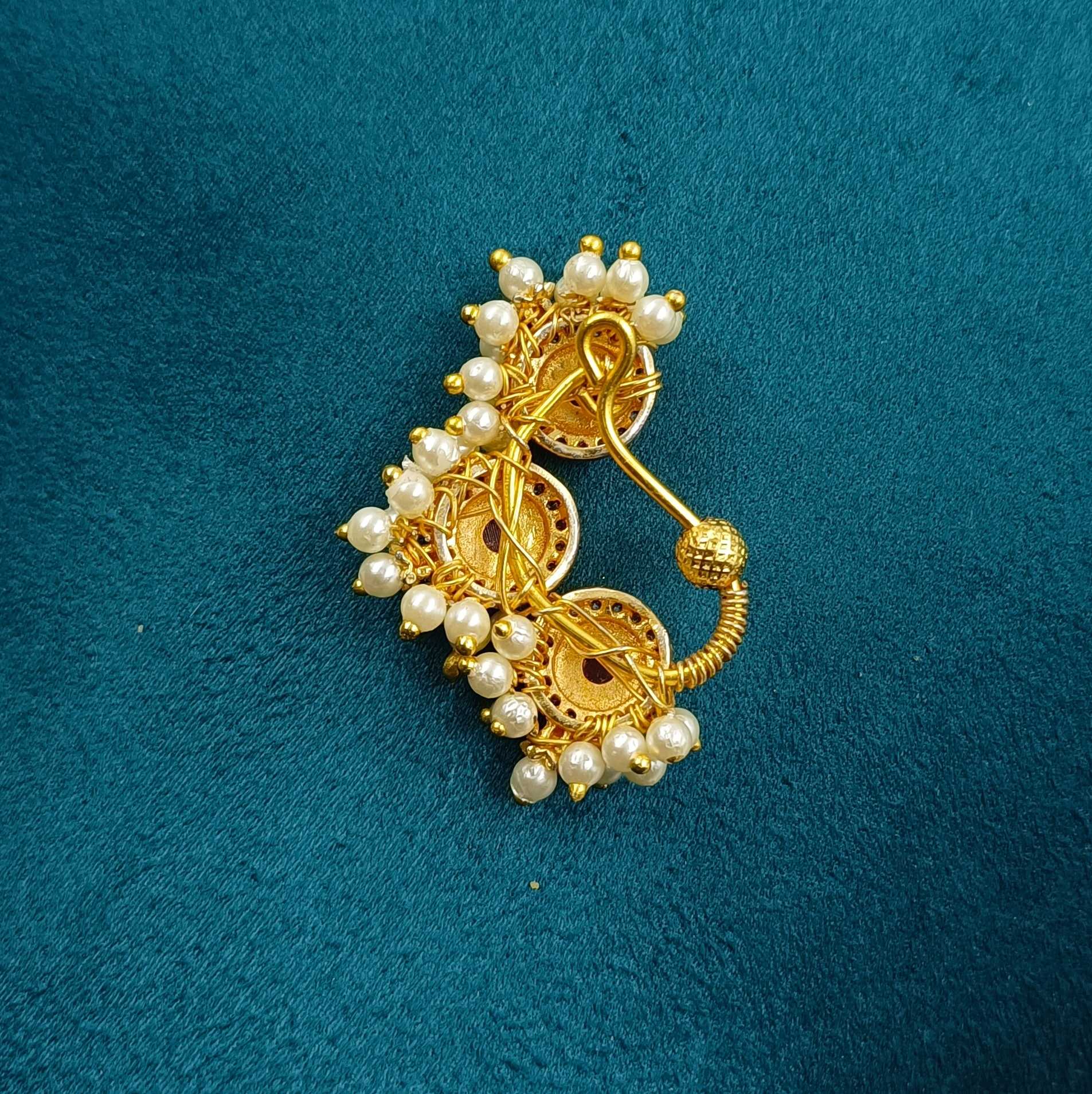 Must have in your accessory moti collection this stunning Maharashtrian nath from Shree Radhe Pearls Jewellery. It is encrusted with sparkling pink, green stones and fashioned from golden finish metal. This nath is easy to wear and not requires piercing.