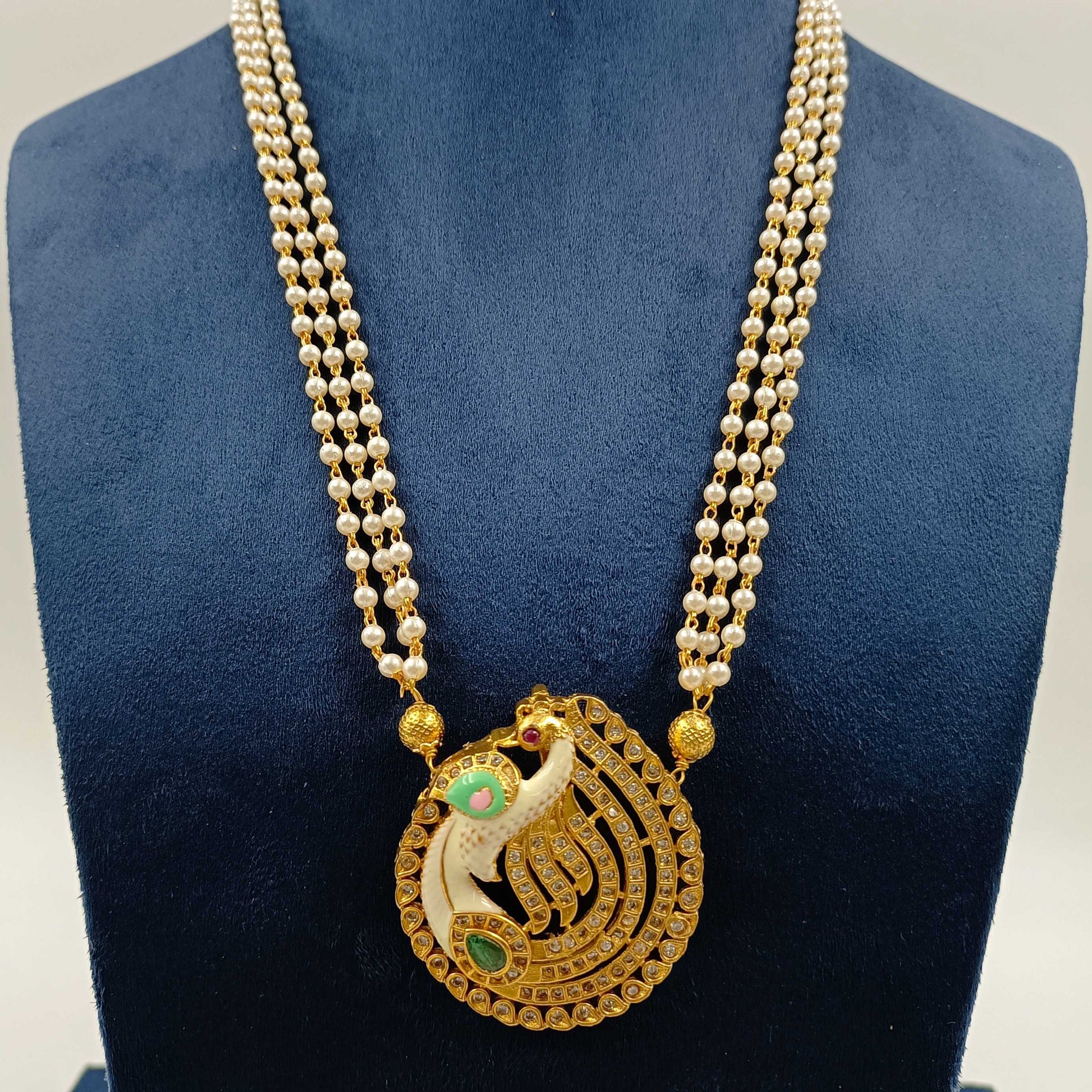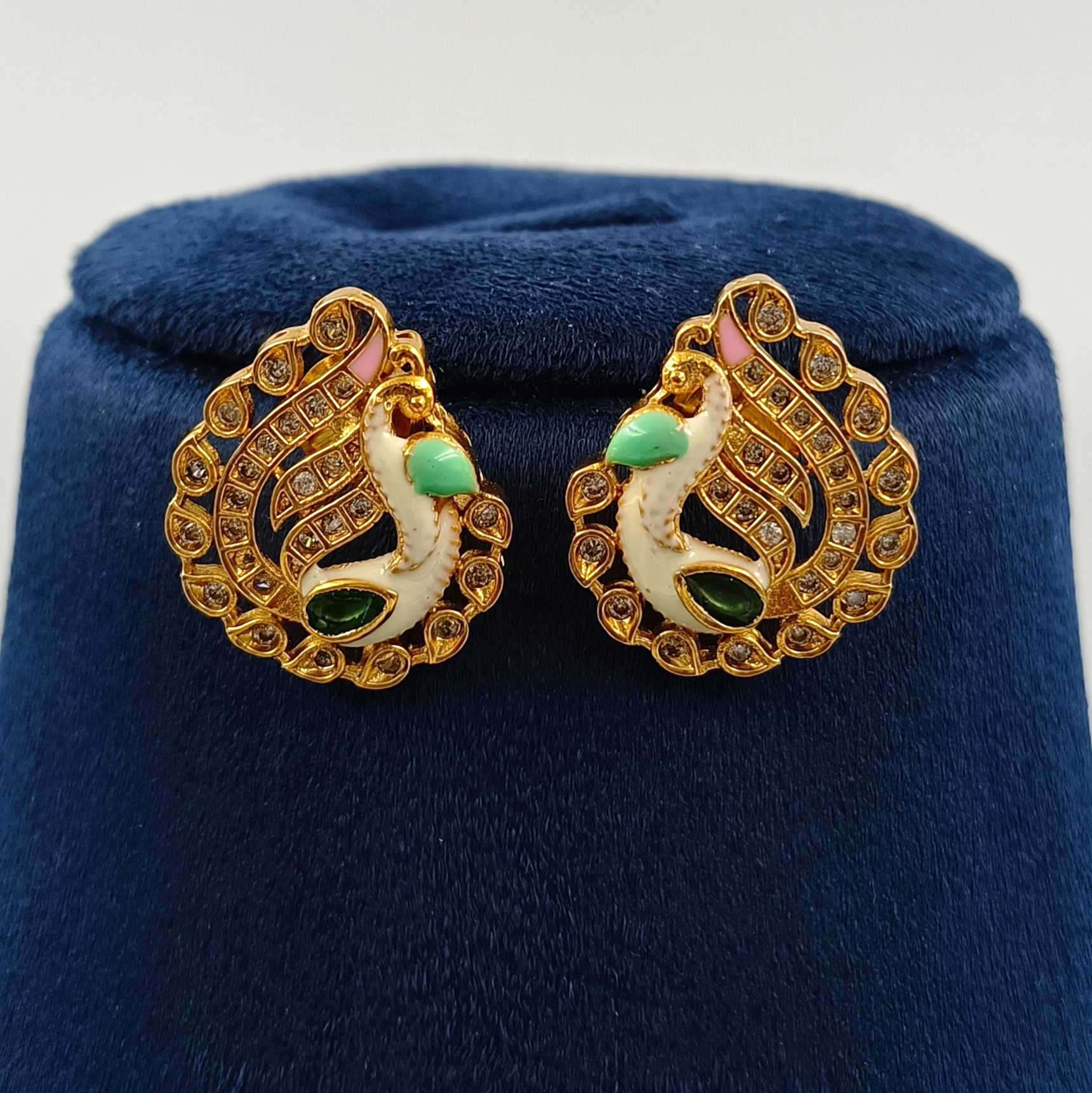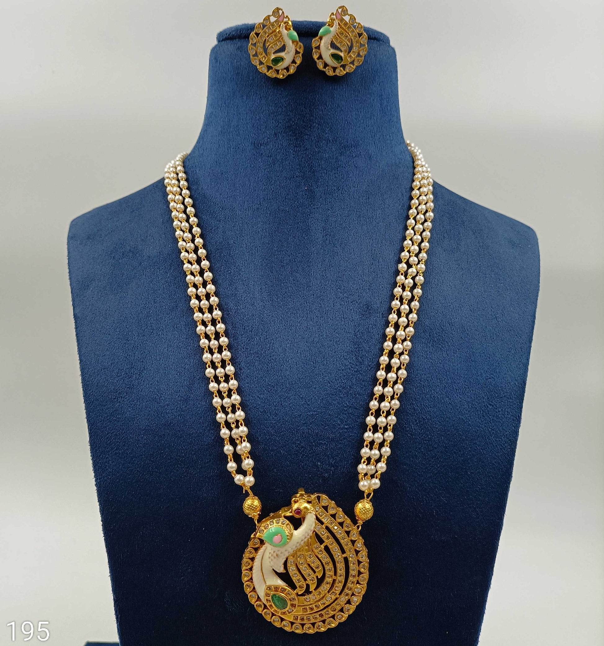 Beautiful matte gold finish sparkling temple necklace with beautiful earring. From Shree Radhe Pearls jewellery. Made with superior quality matte gold finish metal. Classy sparkling stones studded necklace with matching earrings set.
