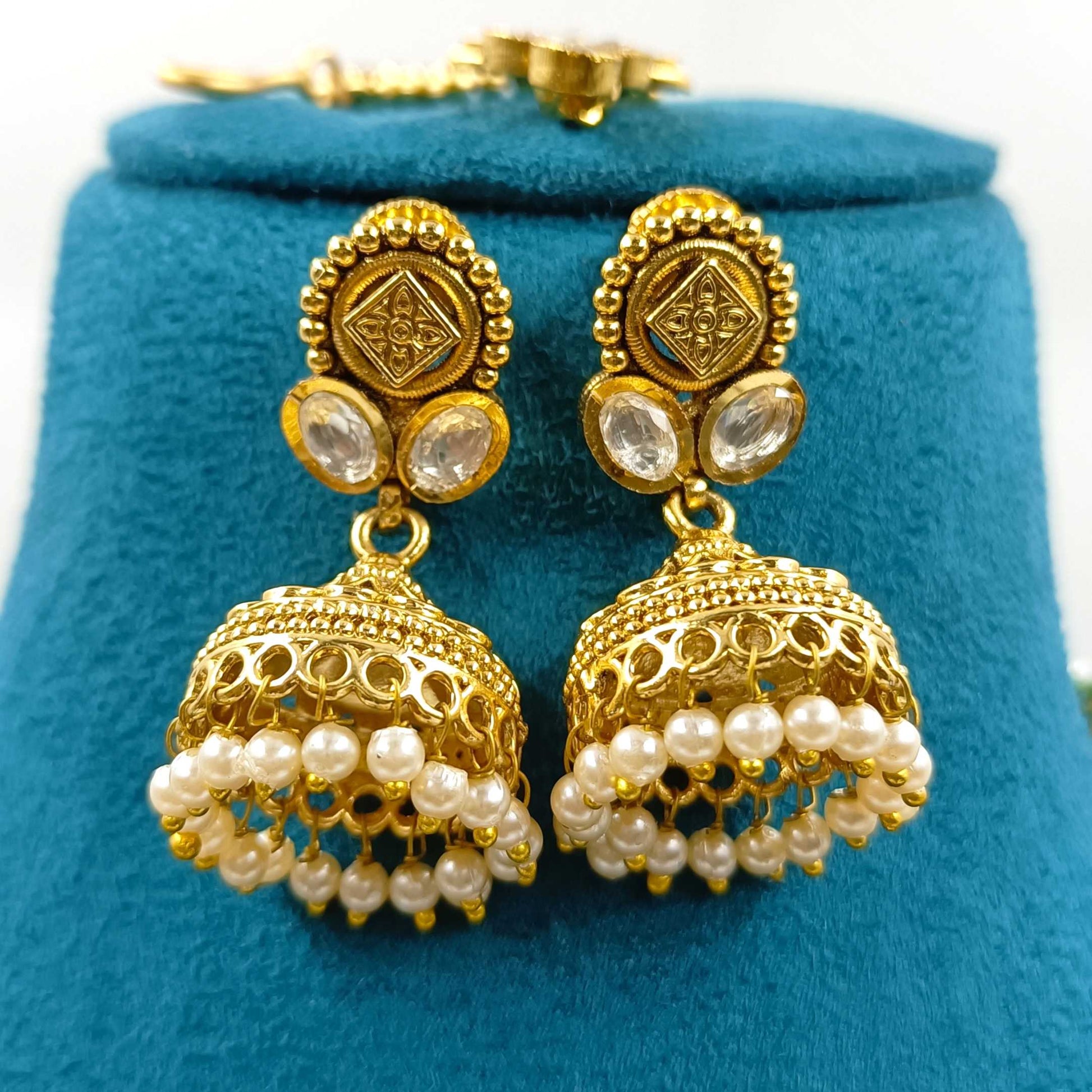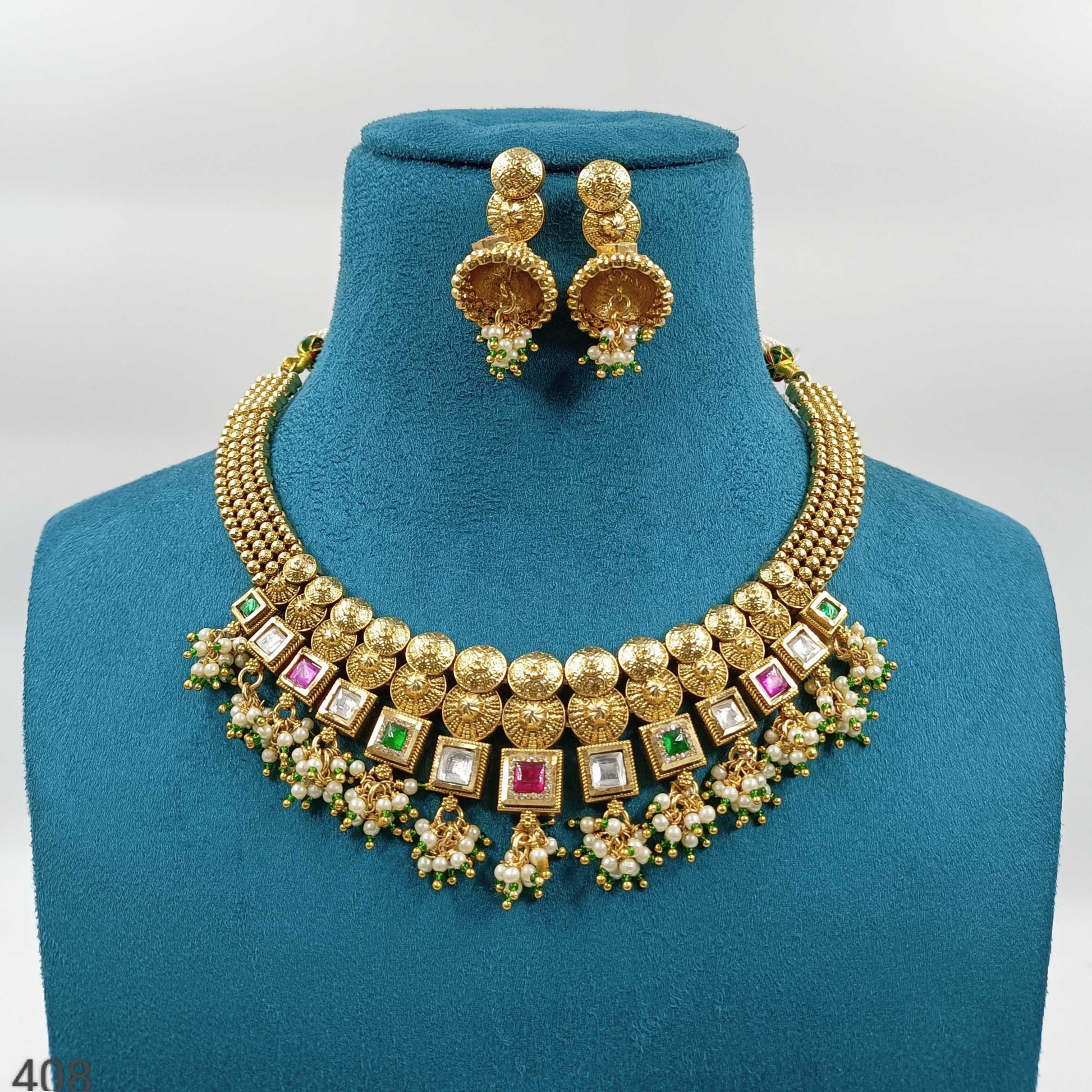 Get that perfect traditional look by clubbing this designer necklace set with your festive costume. It is decked with shiny pink stone and made from matte gold finish metal. It is wonderfully woven with golden beads in tar. This necklace set is superior in quality and rust-resistance as well.
