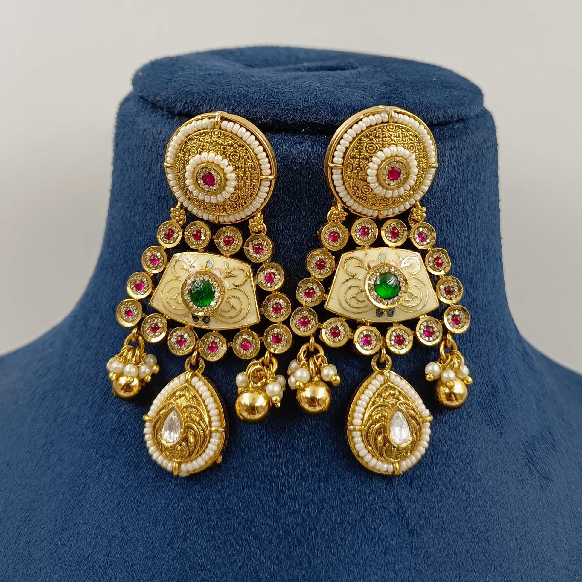 Beautiful matte gold finish sparkling temple necklace with beautiful earring. From Shree Radhe Pearls jewellery. Made with superior quality matte gold finish metal. Classy sparkling stones studded necklace with matching earrings set.