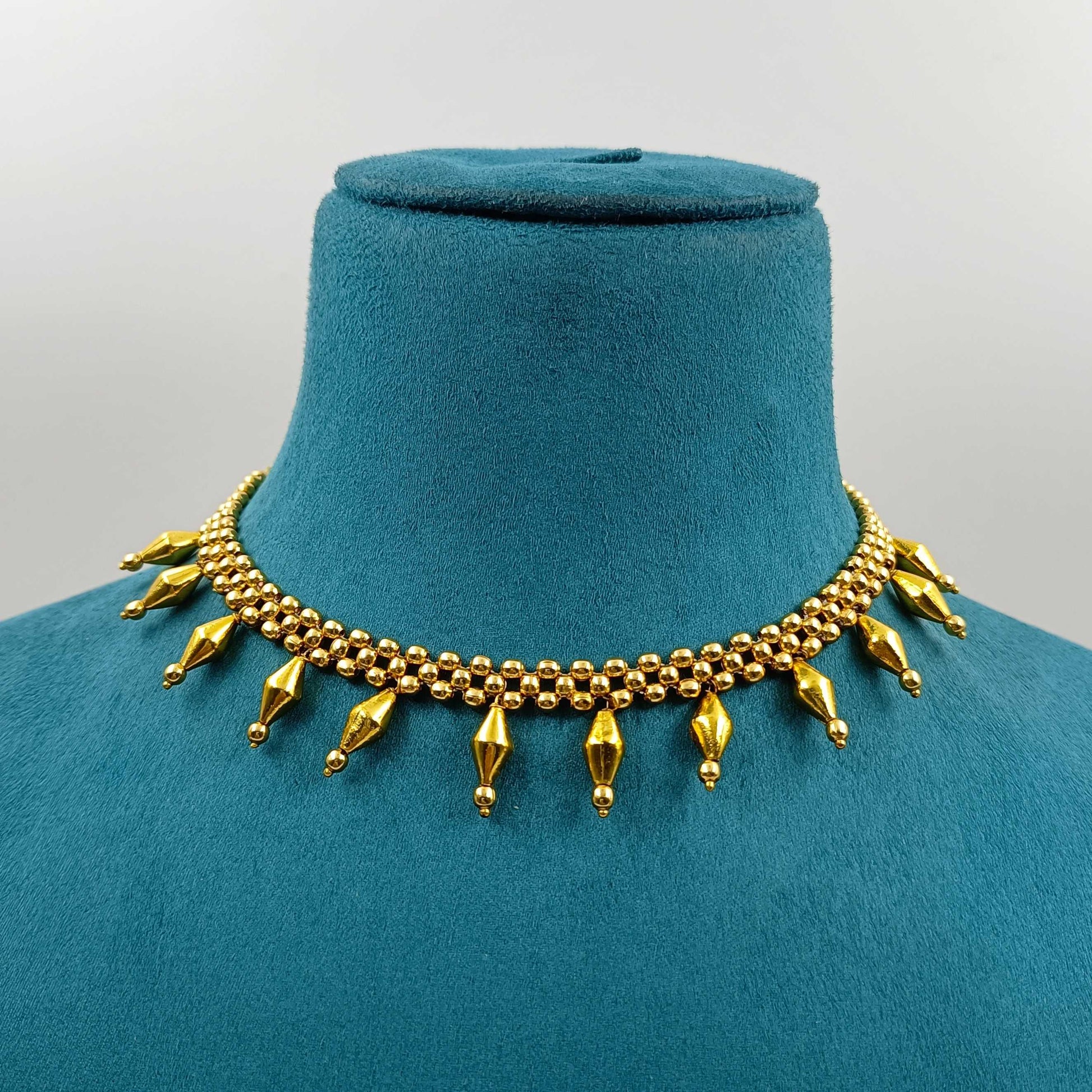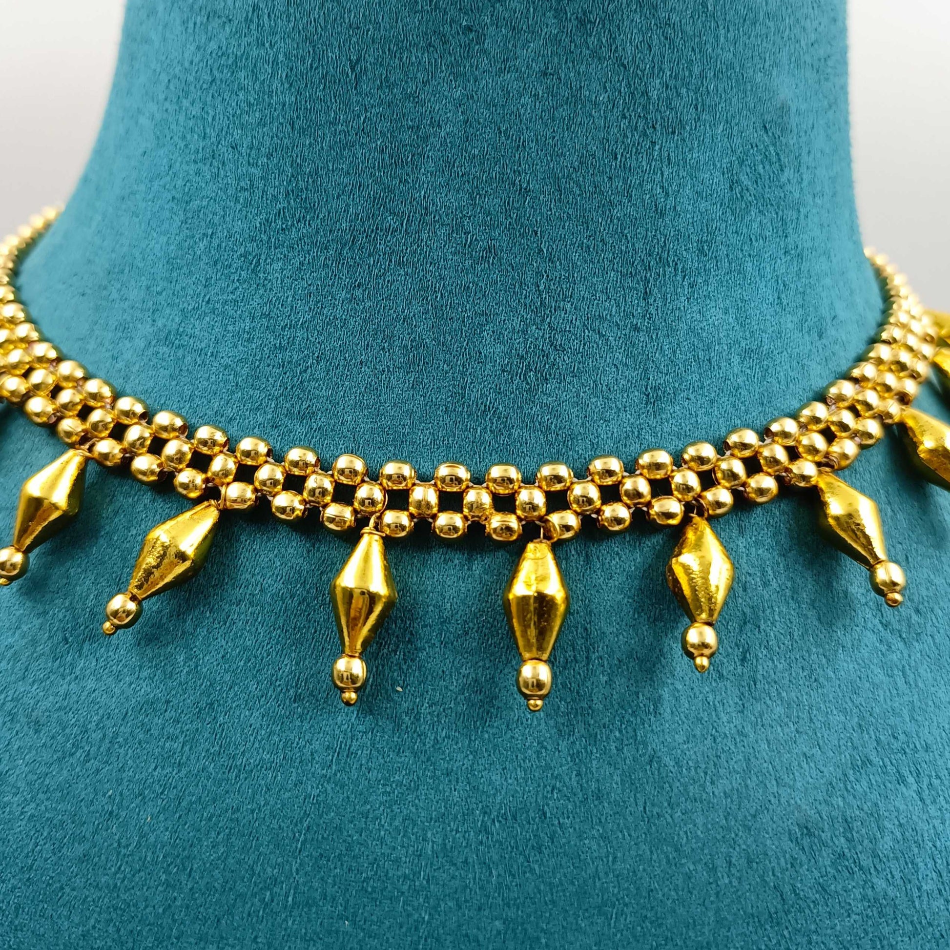 This flawless golden beads Necklace will give you queenly look. This adorable necklace is made up of good quality metal and has golden finish. It has small colour sparkling stone embedded in it. And is woven with golden beads which steals the attraction of people. Fetch a lot of compliments by wearing this fancy necklace.