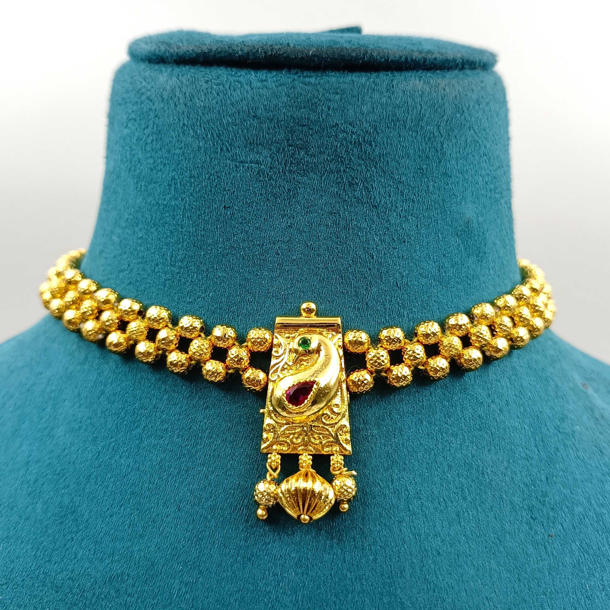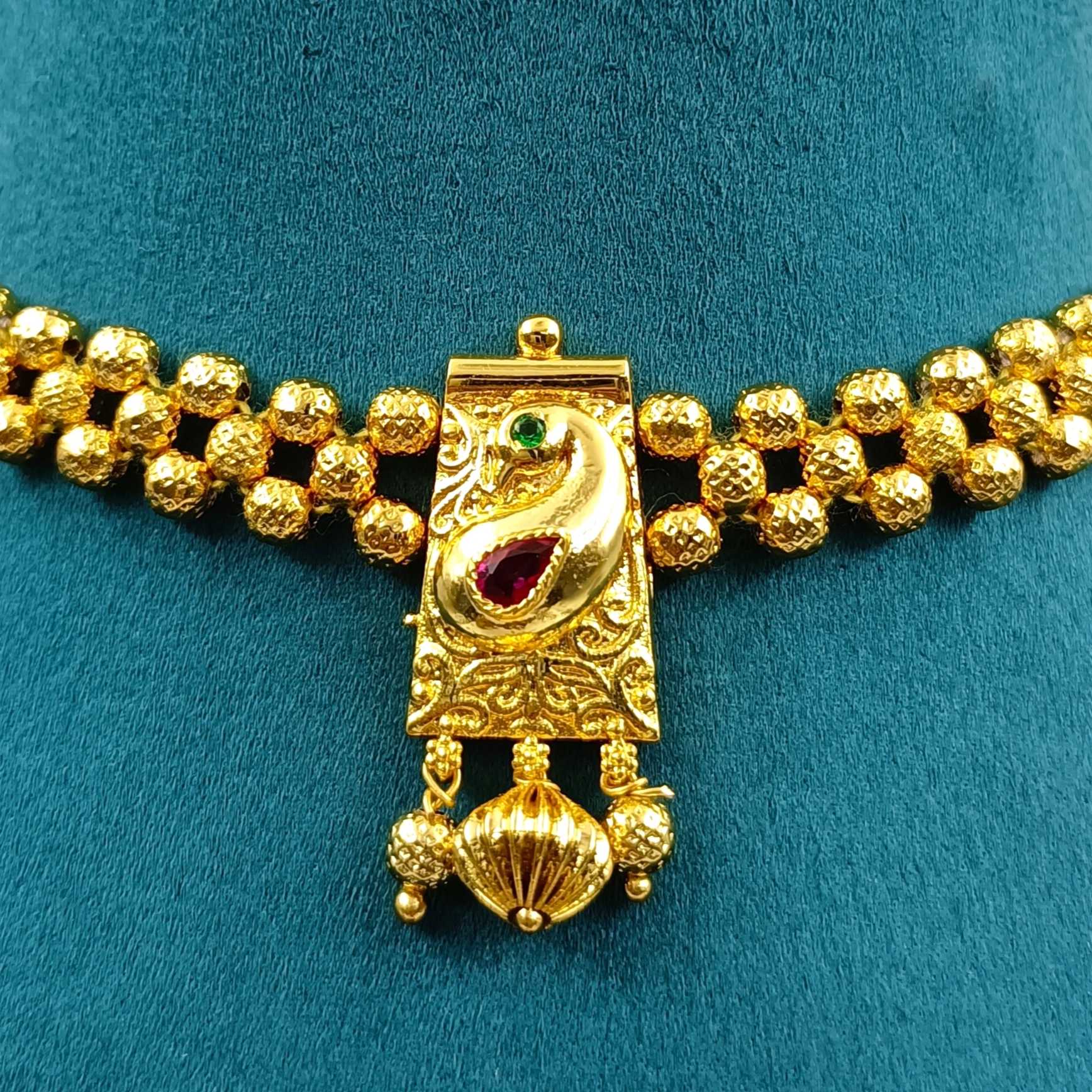 This flawless golden beads Necklace will give you queenly look. This adorable necklace is made up of good quality metal and has golden finish. It has small colour sparkling stone embedded in it. And is woven with golden beads which steals the attraction of people. Fetch a lot of compliments by wearing this fancy necklace.