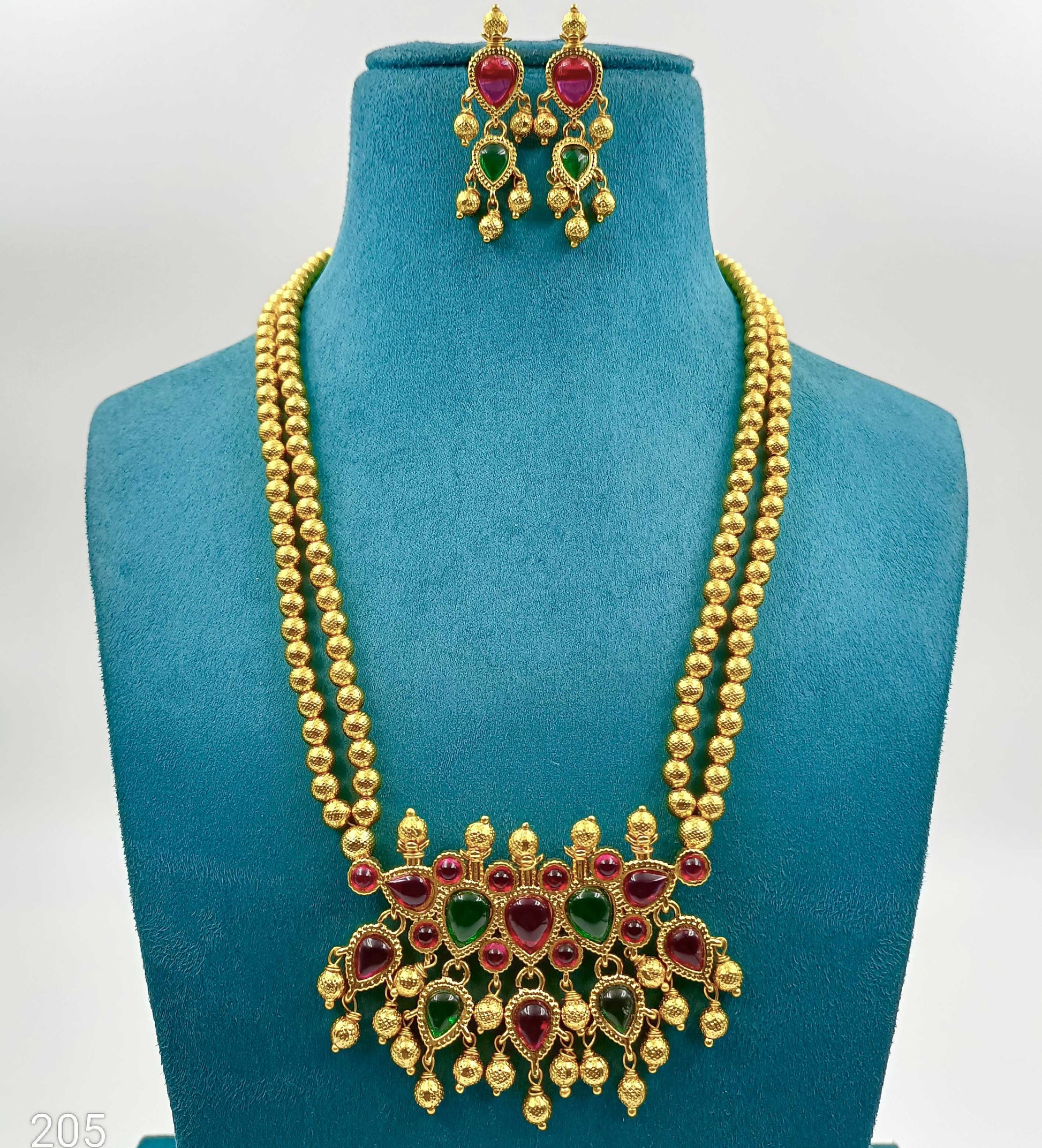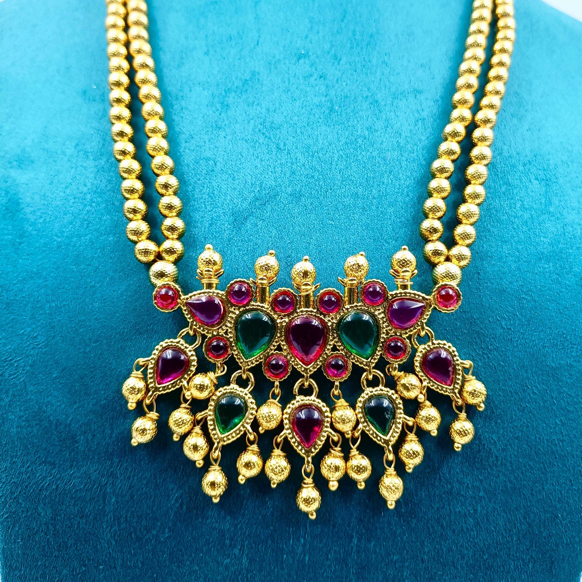 This flawless golden beads Necklace will give you queenly look. This adorable necklace is made up of good quality metal and has golden finish. It has small colour sparkling stone embedded in it. And is woven with golden beads which steals the attraction of people. Fetch a lot of compliments by wearing this fancy necklace.