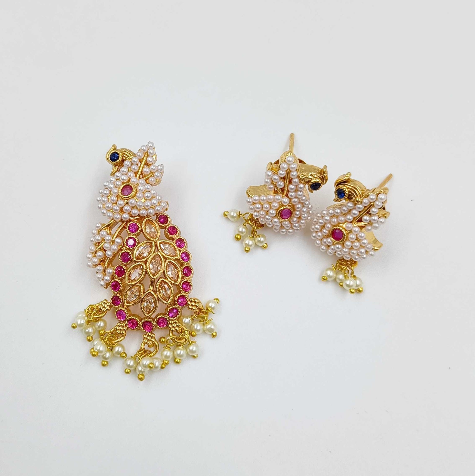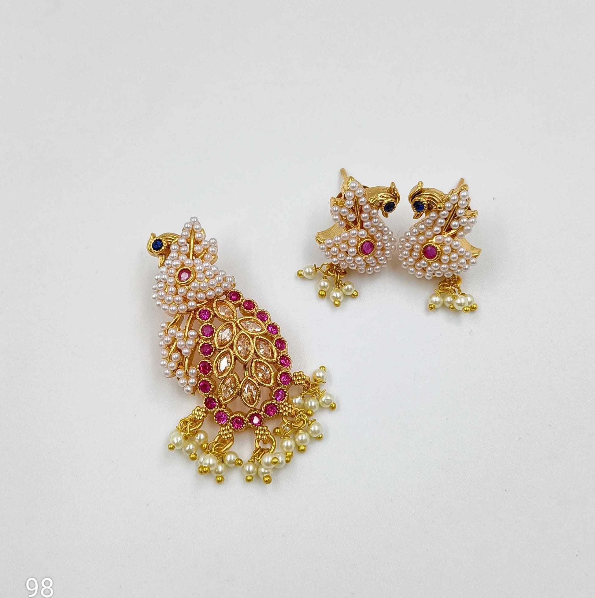 Shree Radhe Pearls Jewellery present beautifully designed pendant set studded with sparkling stone and made with good quality of golden finish metal and highly durable. Turn many heads towards you by wearing this pendant set on perfectly matched attire.
