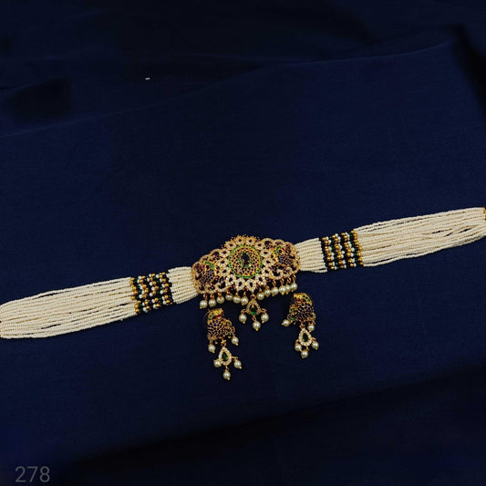 Complete your traditional look by wearing this White pearl beads wonderful necklace with your traditional look. It is decked with sparkling stones and woven with pearl beads and fashioned from golden finish metal. This adorable necklace set is superior in quality and will be your fashion companion for many years.