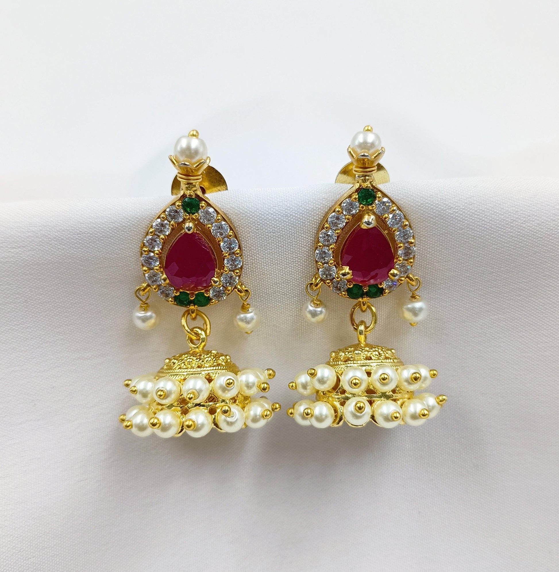 Shree Radhe Pearls Jewellery offers this pair of designer jhumka earrings for women who love to adorn traditional jewellery. They are crafted from golden finish metal and ensure high durability. These are studded with sparkling stone along with pearls. These earrings are good in quality and rust-resistant as well.